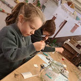 De templates worden op de koek- of snoepjespot en glas geplakt en daarna besmeerd met etspasta. Ondertussen ontwerpen de volwassenen 2 glazen naar keuze met de etspasta.